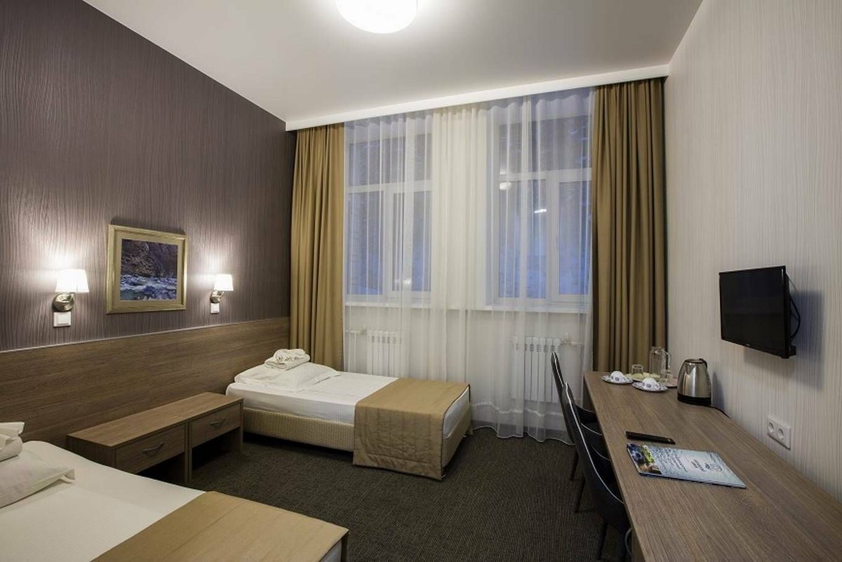 Оснащение номера: односпальные кровати или одна двуспальная, прикроватные тумбы, стол, стулья, шкаф для одежды, набор посуды, телевизор, телефон, холодильник, электрический чайник, сейф