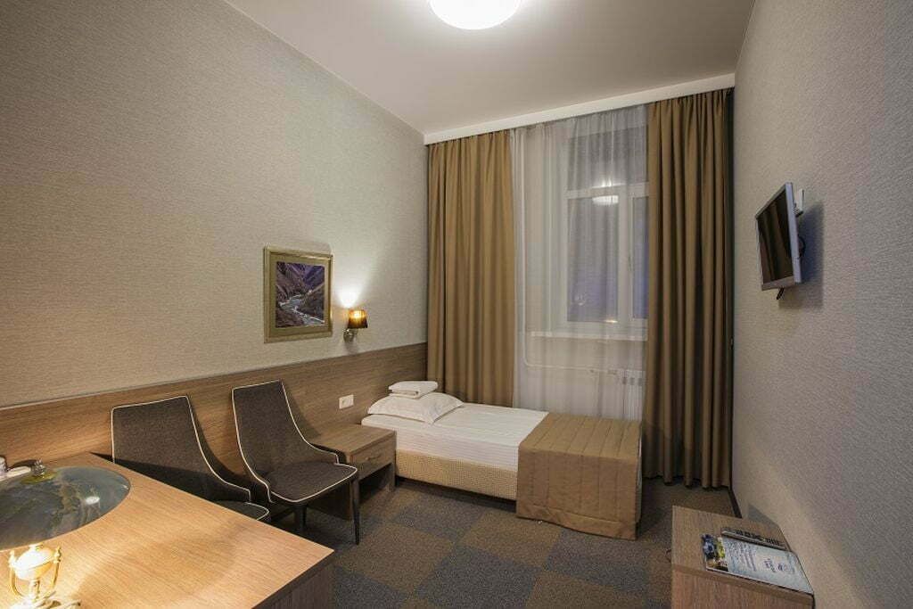 Оснащение номера: односпальная кровать, прикроватная тумбочка, стол, стулья, шкаф для одежды, набор посуды, кондиционер, телевизор, телефон, холодильник, электрический чайник, сейф