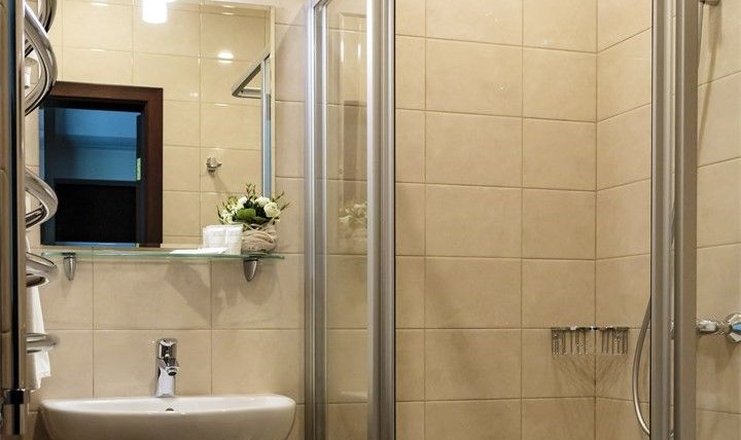 Санузел: с душевой кабиной, тапочки, туалетные принадлежности, фен, халат