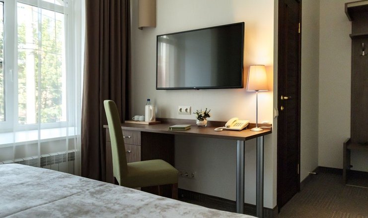В номере: вешалка, кресло, кровать двуспальная, прикроватные тумбочки, стол, стулья, шкаф, кондиционер, телевизор ЖК, телефон, холодильник, чайный набор посуды, электрочайник